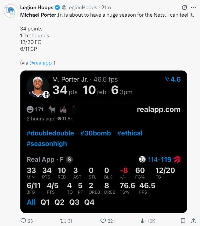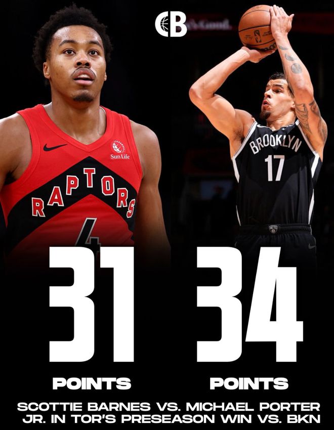 北京时间10月18日,NBA季前赛,篮网114-119惜败猛龙。这场比赛篮网队的核心小迈克尔-波特打出了加盟篮网以来的最佳一战,他全场比赛斩获34分10篮板3助攻6记三分球。